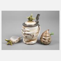 wohl Schierholz Plaue, Ende 19. Jh., ungemarkt, Modellnummern 118 86, 8826 und einer mit Stempel Musterschutz, Krug mit zinngefasstem Deckel und Gravur A. Rademacher seinem lieben Fritz Maske zur freundlichen Erinnerung, München Sommer 1897, dazu ein Senftöpfchen mit Deckel und Löffel und ein Schälchen, zwei Blätter minimalst bestoßen, H max. 15 cm.