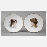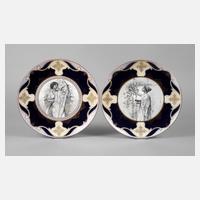 wohl Hüttensteinach, um 1900, Dekornummer 1507 21 bzw. 23, unterglasurblaue Bienenkorbmarke, farbig glasiert, bedruckt, bemalt und vergoldet, im Spiegel zwei Mädchen in römischen Gewändern, umgeben von ornamentalem Dekor, Wandaufhängung aus Draht, gute Erhaltung, D 30 cm.