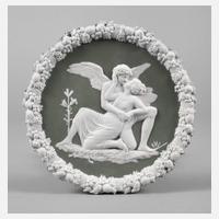1. Hälfte 20. Jh., ungemarkt, wohl Thüringen, geprägte Modellnummer 2894, in Wedgewood-Manier mit grün eingefärbtem Biskuitporzellan und weißen Reliefs, Darstellung Amor & Psyche, umgeben von einer Früchteranke, Ösen zur Wandaufhängung, gute Erhaltung, D 18 cm.