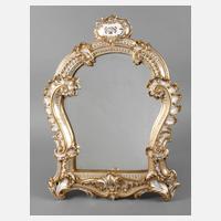 2. Hälfte 19. Jh., ungemarkt, reich mit Rollwerk und Muschelmotiven reliefiert, ornamental vergoldet, in der Bekrönung ein gemaltes Löwenwappen mit Krone und unleserlichem Spruchband, ein Haar- und ein Brandriss, rückseitig minimal bestoßen, nicht ganz komplett, rückseitig mit Eichenholz verkleidet, als Wandspiegel oder Tischspiegel verwendbar, H 73 x B 52 x T 8 cm.