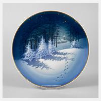 Entwurf Willi Hein 1950, grüne Stempelmarke Germany Kunstabteilung Selb, handgemalt, signiert, Unterglasurbemalung und Vergoldung, Blick durch einen winterlichen Wald auf eine Kirche, Wandaufhängung, gute Erhaltung, D 22 cm.