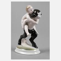 Entwurf A. Caasmann um 1913, signiert, Kriegsmarke 1918, Modellnummer 208, Unterglasurbemalung, nacktes Mädchen, auf einem schreitenden Faun reitend, unbeschädigte Erhaltung, H 14 cm.