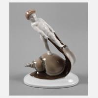 Entwurf Albert Caasmann um 1920, grüne Stempelmarke Selb Bavaria 1924, Modellnummer 602, in Unterglasurbemalung, nackter Putto, eine Schnecke ärgernd, unbeschädigt, H 13,5 cm.