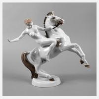 Entwurf Anton Grath 1918, Modellnummer 519, grüne Stempelmarke Germany Kunstabteilung Selb 1930er Jahre, Schriftzug handgemalt, partielle pastelltonige Unterglasurbemalung, weiblicher Akt, auf einem springenden Schimmelhengst reitend, Daumen und Zeigefinger fehlen, H 38 cm.