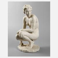 Entwurf Fritz Klimsch 1936, grüne Stempelmarke Germany Kunstabteilung Selb 1948, Biskuitporzellan, cremefarben matt glasiert, hockender weiblicher Akt, gute Erhaltung, H 42 cm.