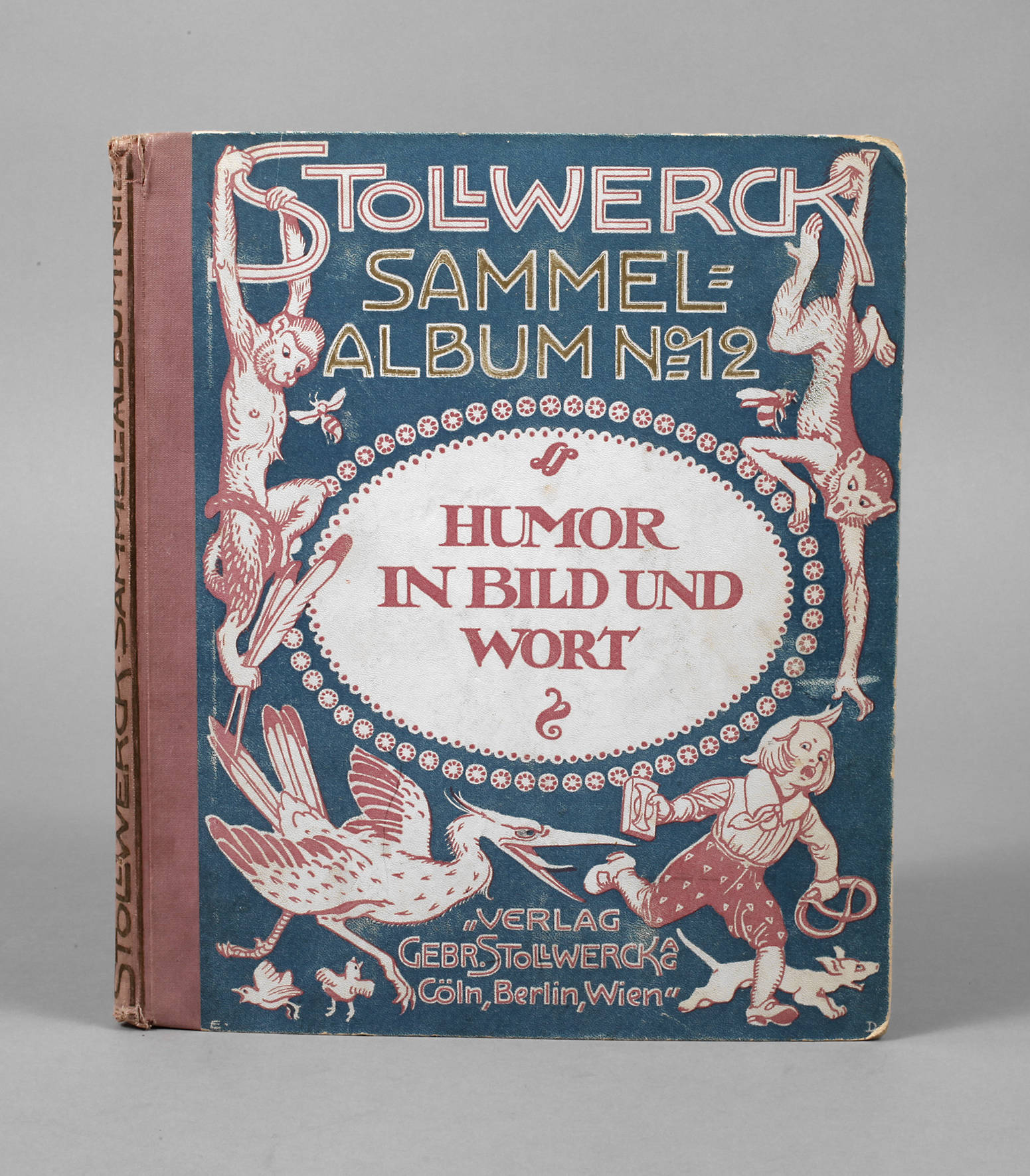 No. 12: Humor in Bild und Wort, Originalbilder von H. Abeking, Bayer-Preusser-Glasemann, Rud. Czerny u.a., Texte von T. Resa, Verlag Gebr. Stollwerck AG Cöln a. Rh., Berlin/Pressburg/London/New York 1911, komplett befüllt mit 24 Serien à sechs Farbbildern (Serie 476 bis 499), in orig. Einsteckalbum mit Titelblatt, Inhaltsverzeichnis, Beschreibungen und Halbleineneinband mit DeckeliIllustr., Alters- und Gebrauchsspuren, Einbandkanten bestoßen, ein Bild mit verstärkter Ecke, wenige mit Kinderkritzelei in Blei, Maße Album 26,5 x 22,5 cm.