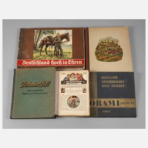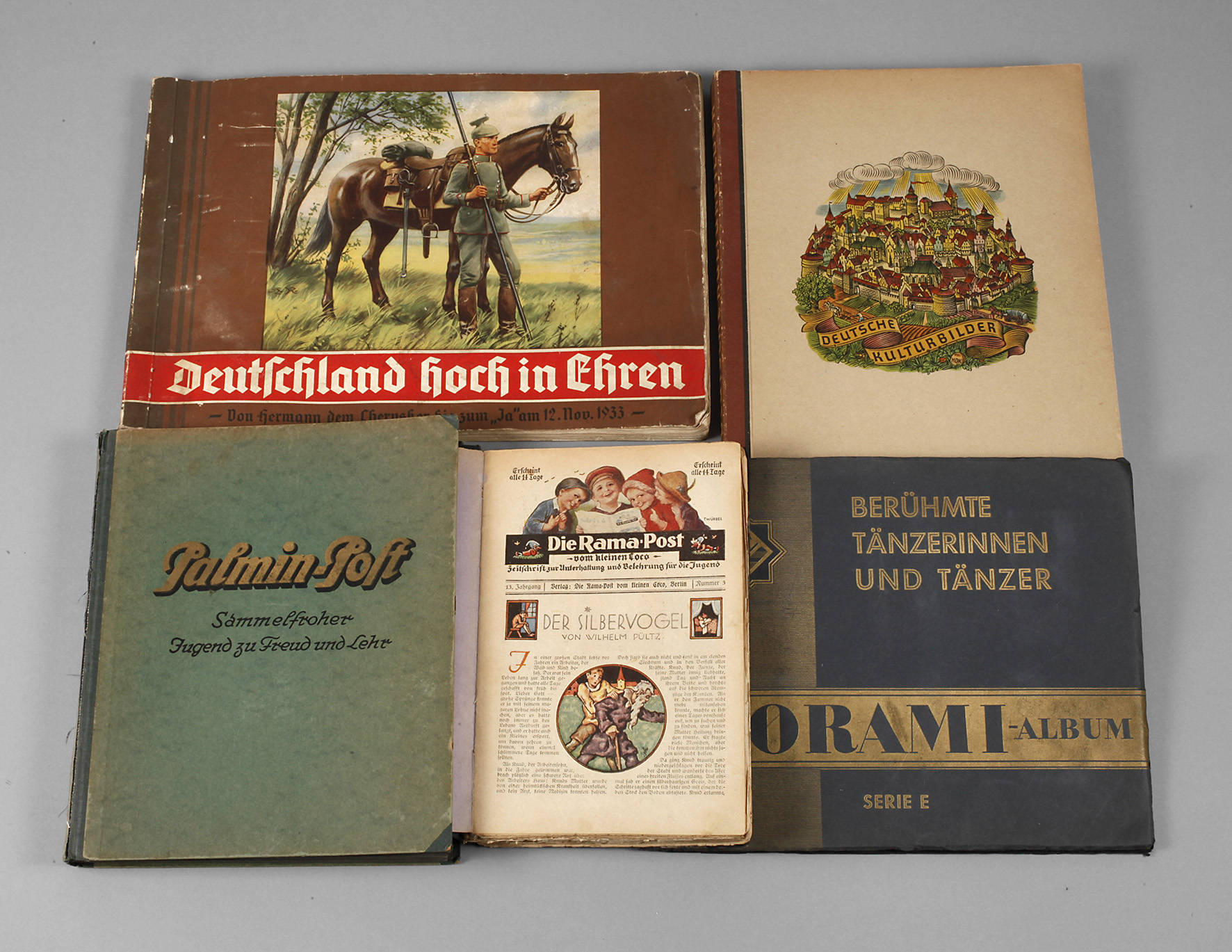 Deutsche Kulturbilder, Berühmte Tänzerinnen und Tänzer, Deutschland hoch in Ehren (unvollständig) sowie Palmin-Post, versch. Hrsg., 1930er Jahre, meist komplett besammelte Alben mit montierten Farbbildern, dazu illustr. Jugend-Zeitschrift Die Rama-Post vom kleinen Coco, Sammelband mit Heften des 13. Jg. 1930 und 14 Jg. 1931, untersch. Alters- und Gebrauchsspuren, Maße max. 25 x 35 cm.