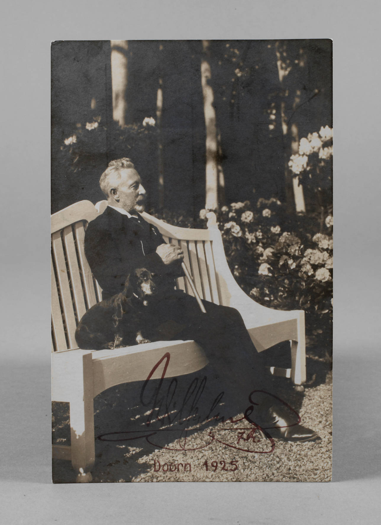Aufnahme im Park von Haus Doorn, der Kaiser im Exil, auf einer Bank sitzend, Fotopostkarte mit vorderseitigem Signum Wilhelm I.R. Doorn 1925 (wohl Stempel), verso undeutliche Dedikation, Alters- und Gebrauchsspuren, Maße 13,6 x 8,6 cm.