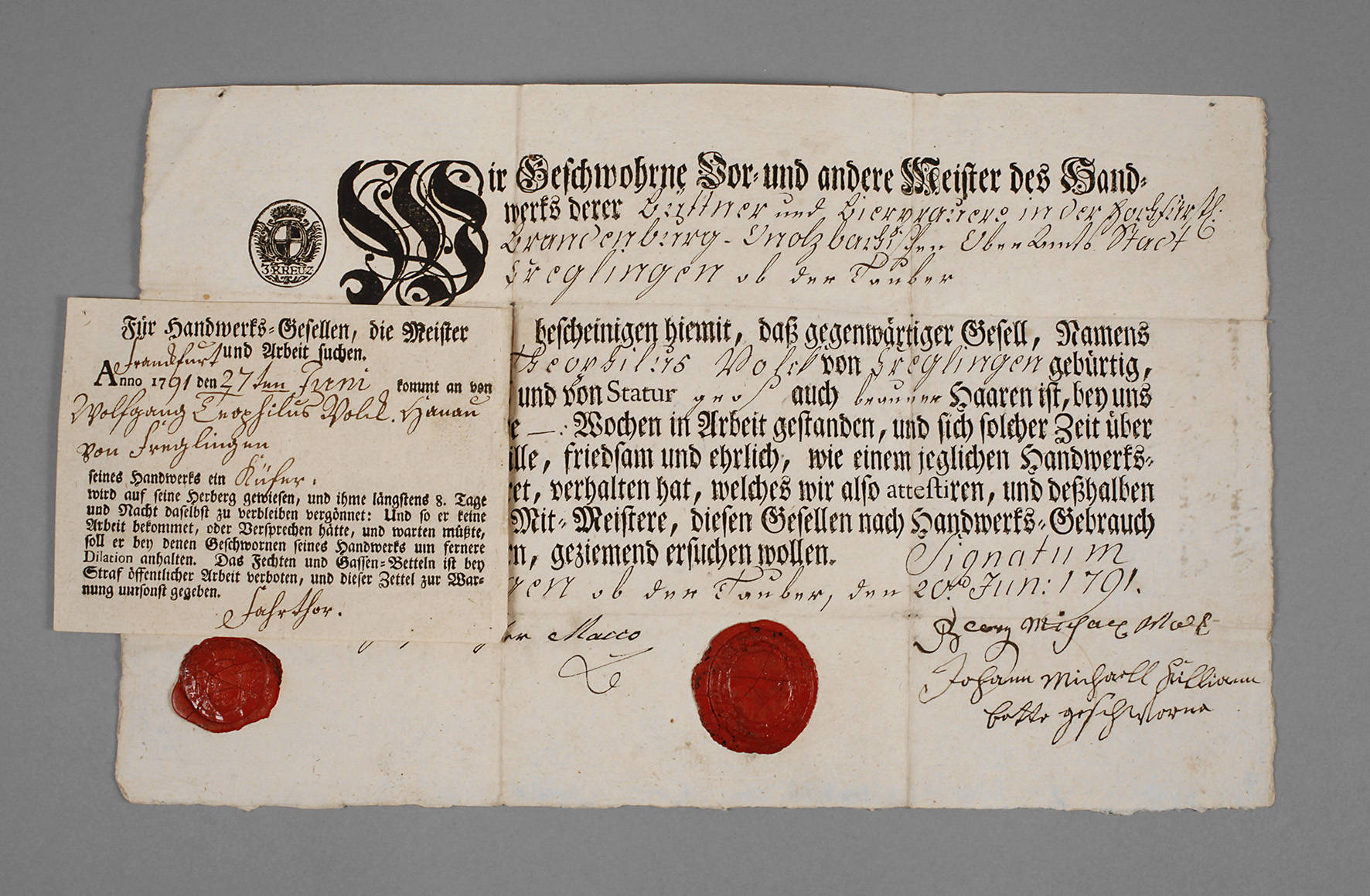 Kundschaftsbrief ”Wir Geschwohrne Vor- und andere Meister des Hand-Werks derer Büttner und Bierbrauer ...” für den Küfer Wolfgang Theophilis Volck, handschriftl. ausgefüllter Vordruck datiert Creglingen ob der Tauber, den 20. Juni 1791, signiert, gestempelt und mit zwei Schelllacksiegeln, dazu Erlass für freie Kost und Unterkunft desselben während der Wanderschaft, handschriftl. datiert 27. Juni 1791, beide gefaltet, Blattmaß 22 x 35 cm sowie 10,5 x 14 cm.