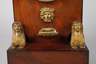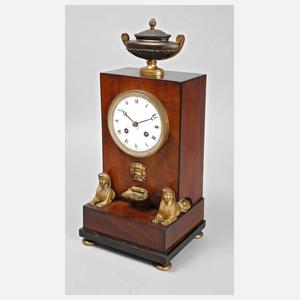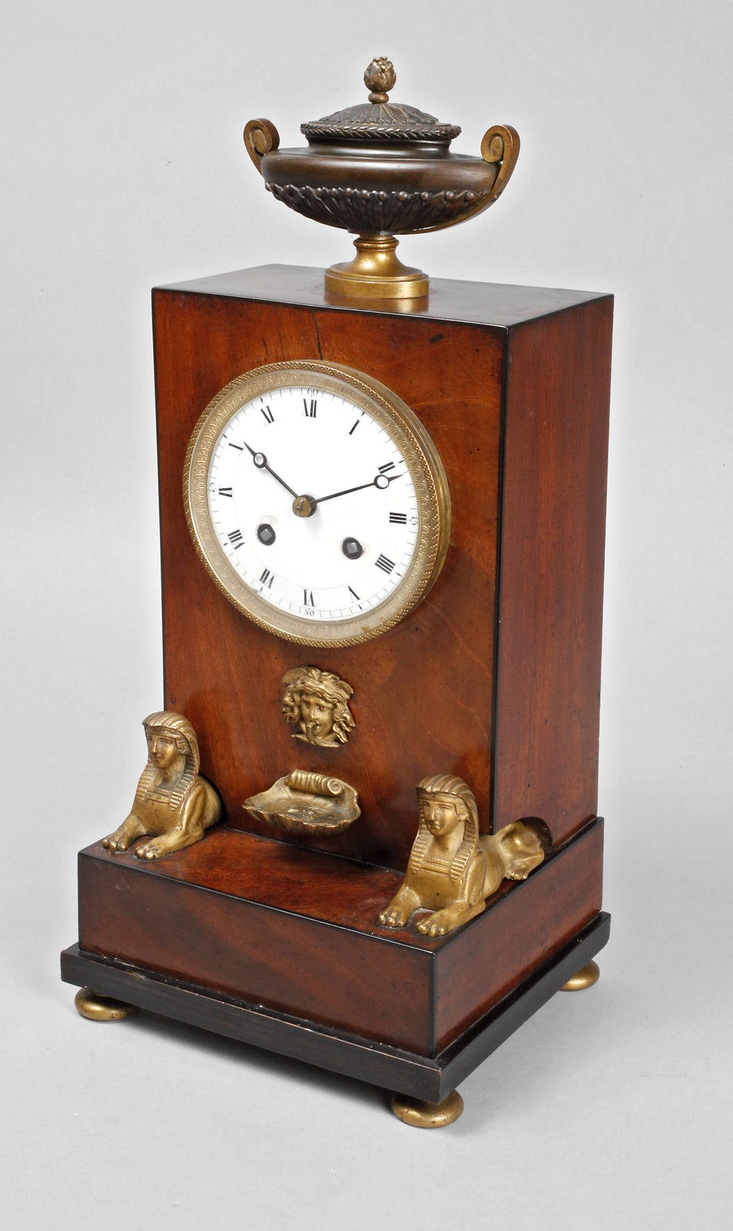 um 1800, Mahagonigehäuse mit ebonisierten Kanten und konsolartig vorgebautem Sockel, Messingfüße, verziert mit zwei liegenden Sphinxen aus Bronzeguss vergoldet sowie muschelförmigem Brunnen, Maskaron als Wasserspeier, bekrönt von Amphorenvase, Werk mit Fadenaufhängung, Halbstundenschlag auf Glocke, rundes Messingplatinenwerk, Emaillziffernblatt mit römischen Zahlen und Minuterie, kleine Chips am Aufzugsloch, funktionstüchtig, guter unrestaurierter Originalzustand, mit Schlüssel, H 44 x B 20 x T 17 cm.