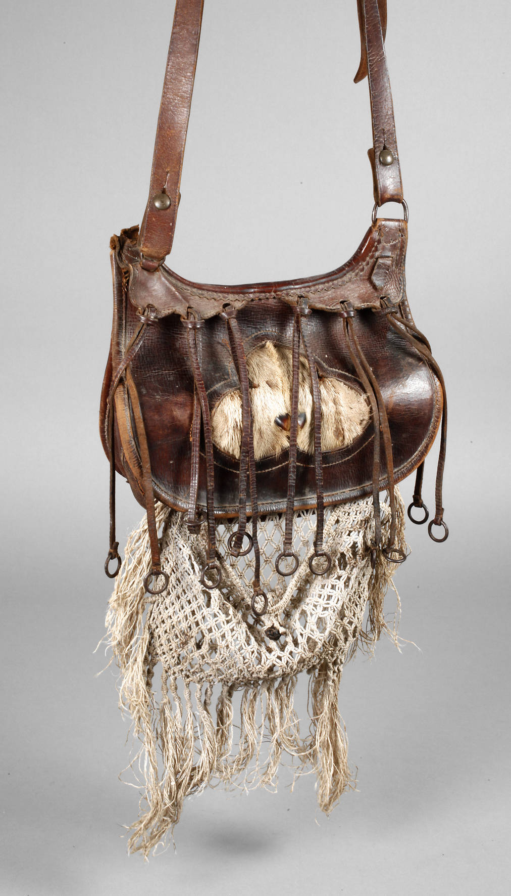 Ende 19. Jh., Satteltasche aus braunem Glattleder, innen mit Einsätzen für Munition, Front mit gehäkeltem Beutel sowie dreipassiger Aussparung mit Felleinsatz, zusätzlich div. abgehängte Ösen, Alters- und Gebrauchsspuren, Maße 40 x 25 cm.