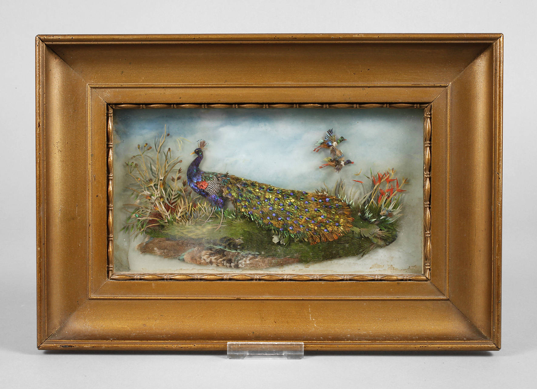 um 1890, als Diorama gearbeitet, Darstellung eines prächtigen Pfaus in Landschaft sowie zweier auffliegender Enten vor gemaltem Hintergrund, aufwendige Arbeit aus zahllosen Federn, in vergoldeter Leiste gerahmt, leichte Altersspuren, Maße ges. 33 x 23 cm.