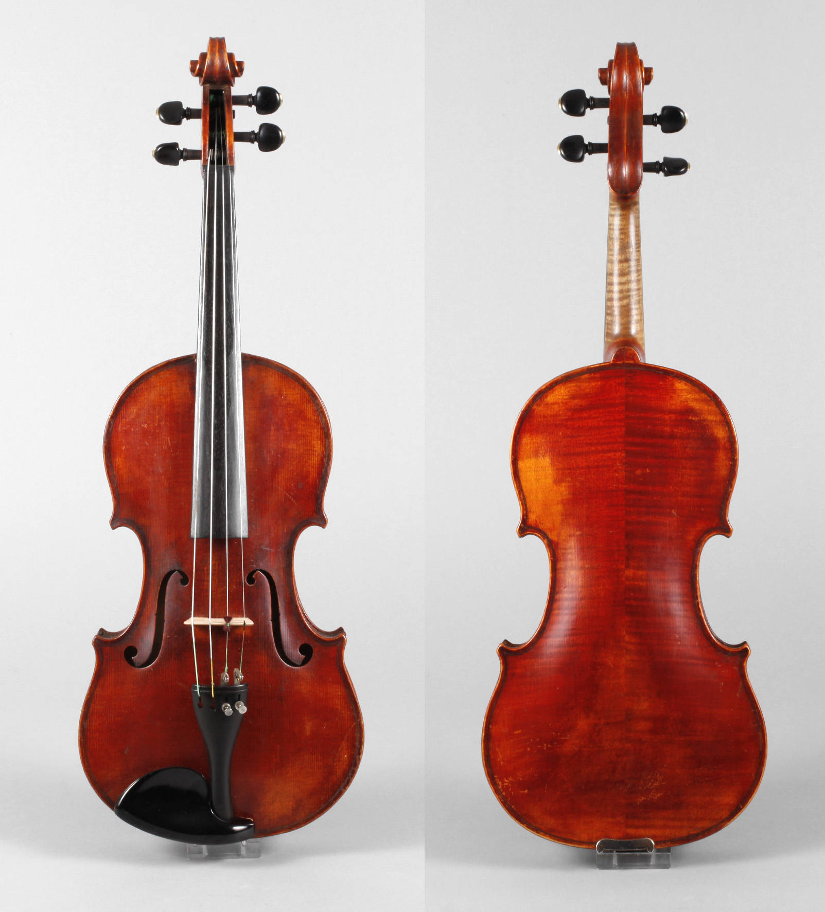wohl süddeutsch, um 1900, mit Zettel Piegendorfer Nachfolger Otto Ebner Geigenbaumeister, geteilter, leicht geflammter Boden in rötlich-braunem Lack, dreiteilige umlaufende Randeinlage, Decke mit kurzem verfestigten Riss, Alters- und Gebrauchsspuren, mit def. Bogen, L Korpus 35,7 cm.