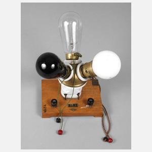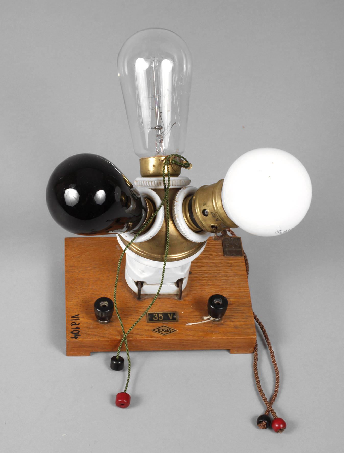 um 1920, dabei Siemens Zweifadenbirne mit Hell-/Dunkelschaltung über integrierten Schalter mit Wippe und Kordeln sowie Phillips Zweifadenbirne mit Hell-/Dunkelschaltung über integrierten Schalter mit Wippe und Kordeln und Dunkelkammerleuchte in Rot, alle funktionstüchtig, auf Holzsockel montiert, H 20 cm.