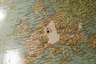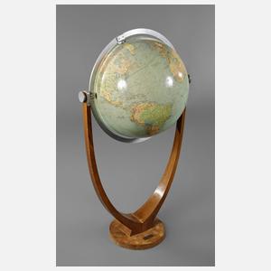 um 1930, auf Plakette bezeichnet Gestiftet von der Sparkasse Selb Rehan, gemarkt Columbus Erdglobus, Politische Ausgabe, Columbus Verlag Paul Oestergaard KG Berlin und Stuttgart, auf gabelförmigem, hell furniertem Stand, Erdkugel aus Masse mit farbiger Papiermontierung, Erhaltungsmängel, H 117 cm.
