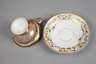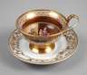 um 1850, ungemarkt, fast komplett vergoldet, mit umlaufenden Ornamentbändern, Tierkopfhenkel mit Blattabschluss, innen Szenerie zweier Mühlespieler mit Mutter, Kind und Hund, gute Erhaltung mit normalen Altersspuren, dazu eine ergänzte Untertasse Tiefenfurt mit Adlermarke und Nummer 48, diese mit beriebener Vergoldung, H zusammen 9,5 cm.