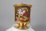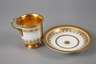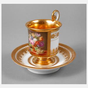 1. Hälfte 19. Jh., ungemarkt, Zylindertasse mit ausschwingendem Lippenrand und eingezogenem Stand mit horizontalem Reliefdekor, Volutenhenkel mit Blattabschluss, reiche teilradierte Vergoldung, schauseitig eine polychrom bemalte Rechteckkartusche, Blumenbukett, Vogel und Früchte auf einem Tisch, originale? Untertasse, geritzter Buchstabe N, am Stand kleinere, wohl herstellungsbedingte Fehlstellen sonst gute unbeschädigte Erhaltung, im Tassenboden zwei winzigste unbedeutende Brandflecken, H zusammen ca. 12,5 cm.
