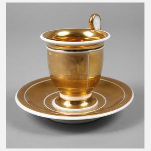 um 1830/40, ungemarkt, glockenförmige Tasse mit hochgezogenem Volutenhenkel, reiche Vergoldung, schauseitig eine radierte Landschaftsdarstellung mit Gebäude, originale Untertasse, leichte Gebrauchsspuren, H 12 cm.