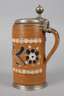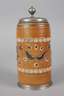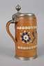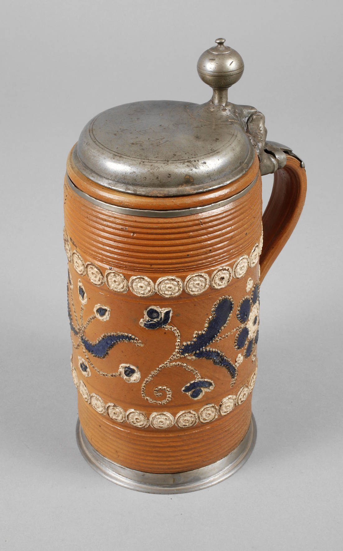 um 1770, auf dem Deckel datiert, mit dem Besitzermonogramm M.E.M., innen gepunzt, Steinzeug handabgedreht, ockerbraune Glasur mit kobaltblauer Bemalung, aufgesetzte kleine Blütenauflagen, perlgefasste Blumen im Mittelteil, Zinnstandring, unter dem zurückgesetzten Lippenrand ein Rillenband aus Zinn, florale Verzierung am Henkel, größere gelötete Stelle am Gelenk, sonst gute, unbeschädigte Erhaltung, H 26,5 cm.