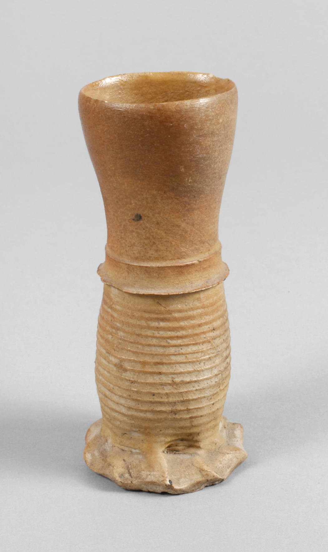 vor 1600, hellgraues Steinzeug, leicht braun überfangen, horizontaler Rillendekor, gedrückter Fuß, oberer Teil restauriert, H 14 cm.