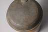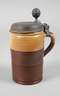 um 1745, mit honiggelber und rotbrauner Bleiglasur, Rillendekor, handabgedreht, übergreifender Zinndeckel mit ungedeuteten Punzen und Gravur ”No 19”, Zinn korrodiert, kleine Ausbrüche am Stand und eine herstellungbedingte Druckstelle, H 21,5 cm.