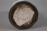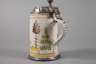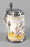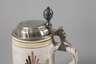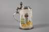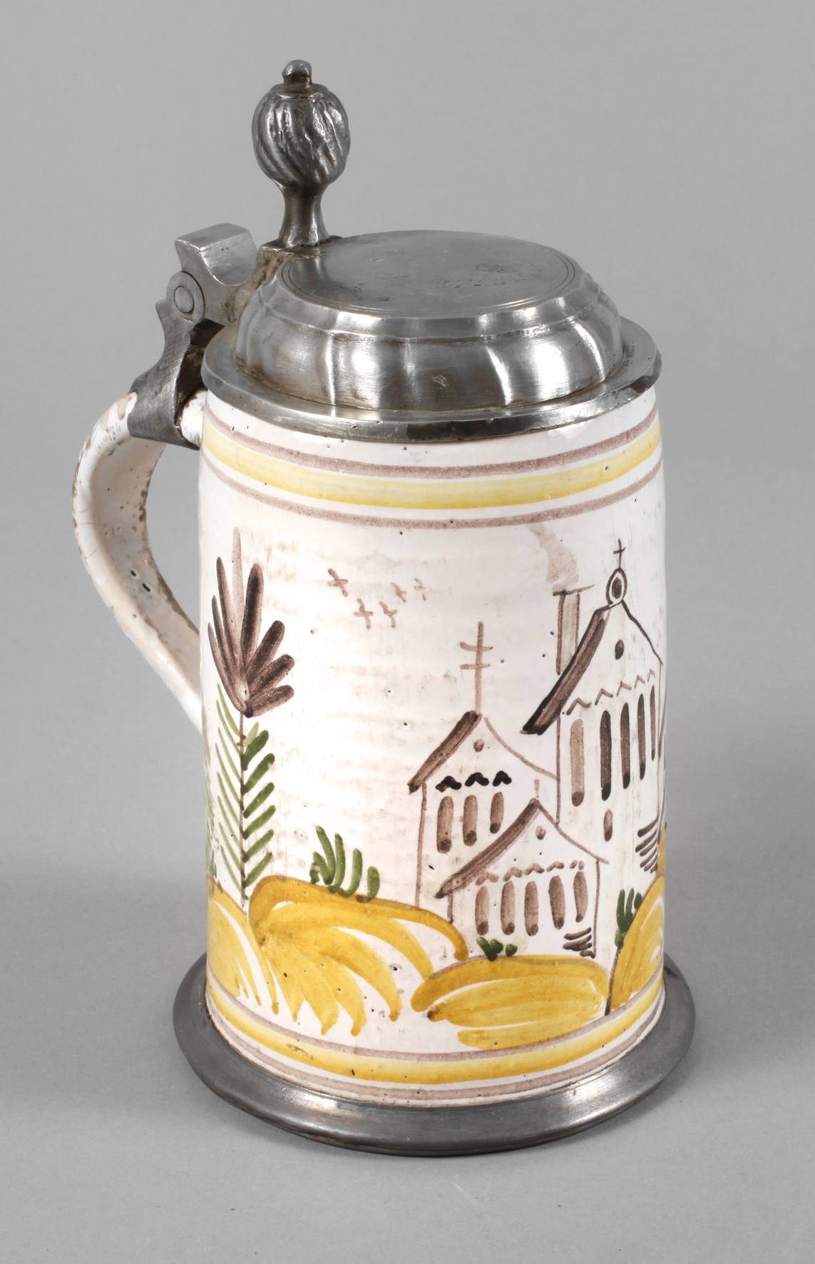 datiert 1820, monogrammiert ”B”, cremeweiße Glasur und Scharffeuerfarben, Architekturmalerei und Bäume in Braun, Gelb und Grün, Zinnstandring, godronierter Deckel mit Kugel, Gebrauchsspuren, H 20 cm.