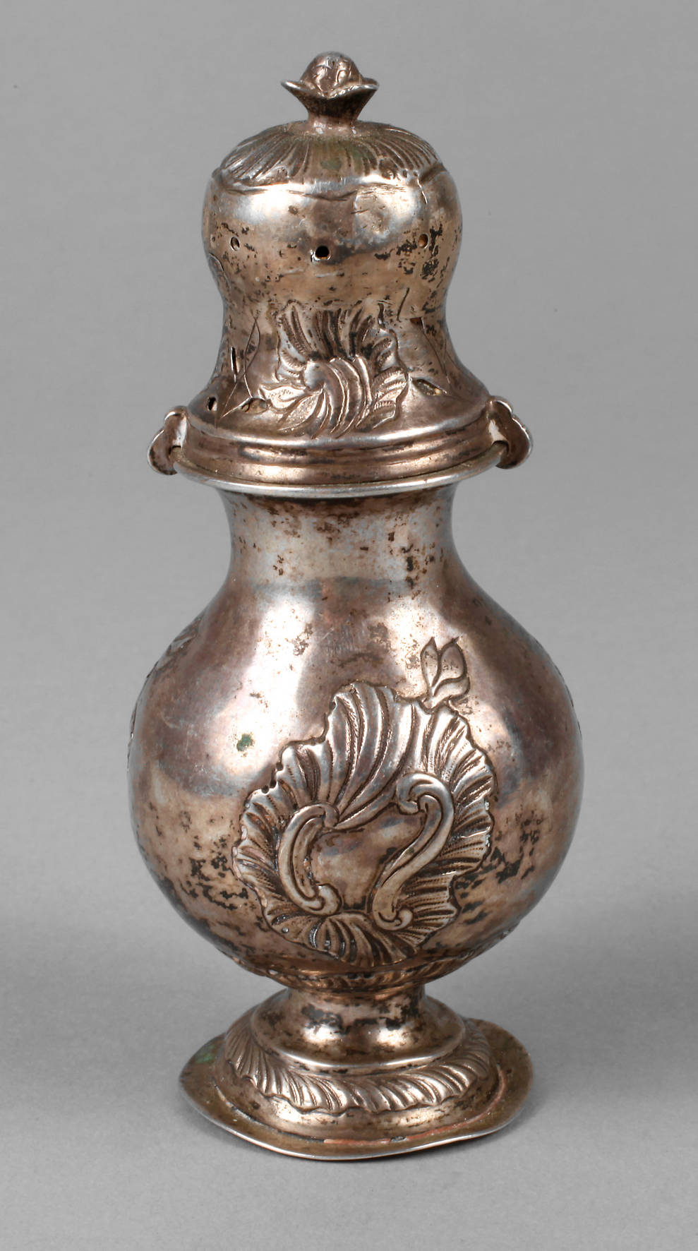 18. Jh., im Boden unleserlich gepunzt, fein getrieben mit Rocaillen- und Muschelmotiven, drehbarer Kopf mit Sicherheitsverschluss, etwas gedellt, sonst gute originale Erhaltung mit normalen Altersspuren, H 12,5 cm, G ca. 83 g.
