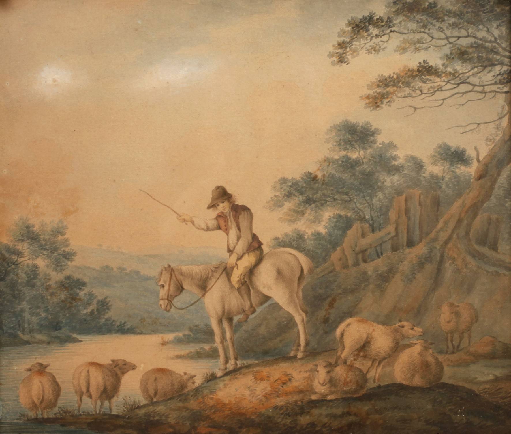 hügelige Landschaft mit Bauernjunge und Schafen an einem Gewässer, mit spitzem Pinsel festgehaltene Genremalerei, Aquarell, 1. Hälfte 19. Jh., unsigniert, gegilbt, in prachtvollen Goldstuckrahmen gerahmt (rest.bed.), Falzmaß ca. 27,0 x 31 cm.
