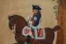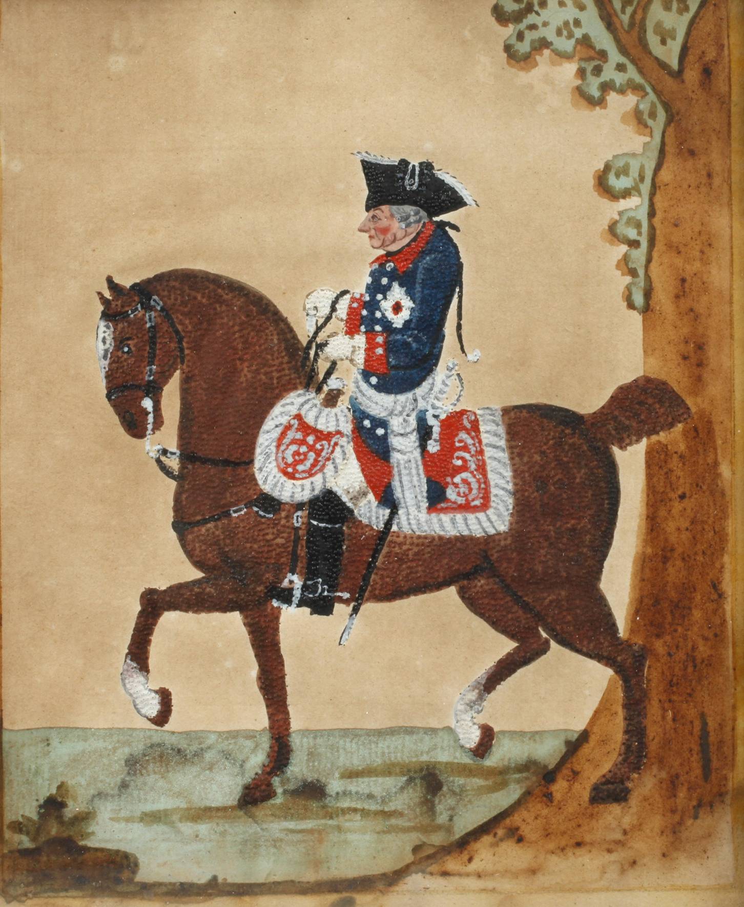 karikierende Darstellung des Preußenkönigs als Reiter, Deckfarben auf Bütten mit angeschnittenem Wasserzeichen, um 1780, unsigniert, Körper des Königs und des Pferdes mit zahlreichen Nadelstichen perforiert, Erhaltungsmängel, hinter Glas gerahmt, Falzmaß ca. 19,5 x 16,0 cm.