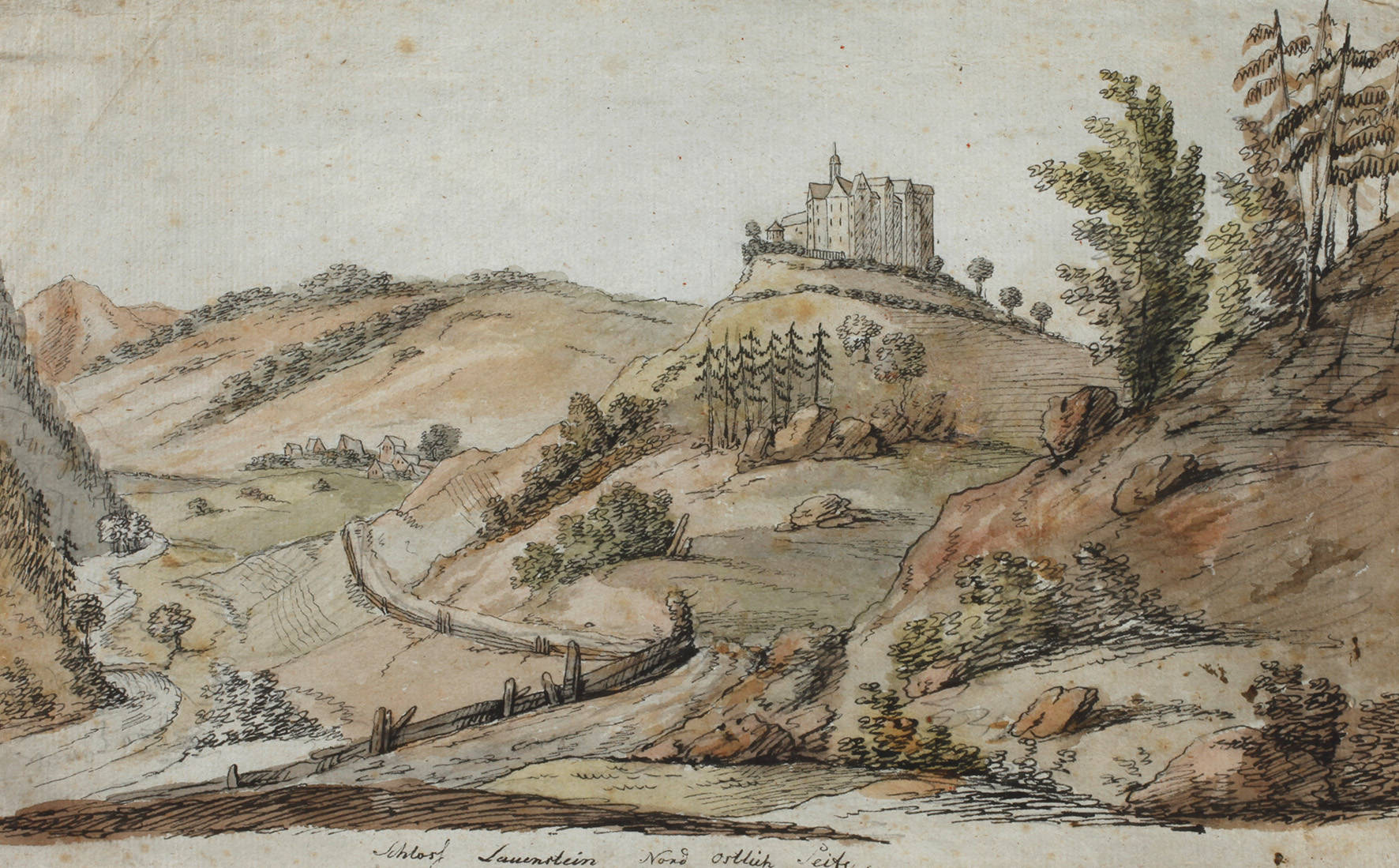 Ansicht des in der 2. Hälfte des 16. Jh. über dem Tal der Müglitz durch Günther von Bünau erbauten Schlosses im Osterzgebirge, aquarellierte Federzeichnung auf grünlichem Bütten, 2. Hälfte 18. Jh., unter der Darstellung betitelt ”Schloss Lauenstein Nord Östliche Seite”, leichte Altersspuren, unter Passepartout montiert, Blattmaß ca. 22,0 x 35,0 cm.