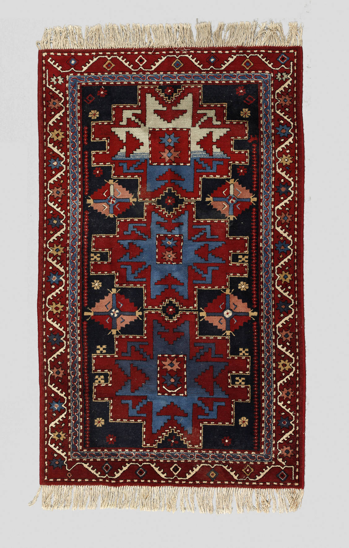 1. H. 20. Jh., großformatiger geometrischer Dekor über dunklem Grund, guter Zustand, Maße 185 x 113 cm.
