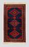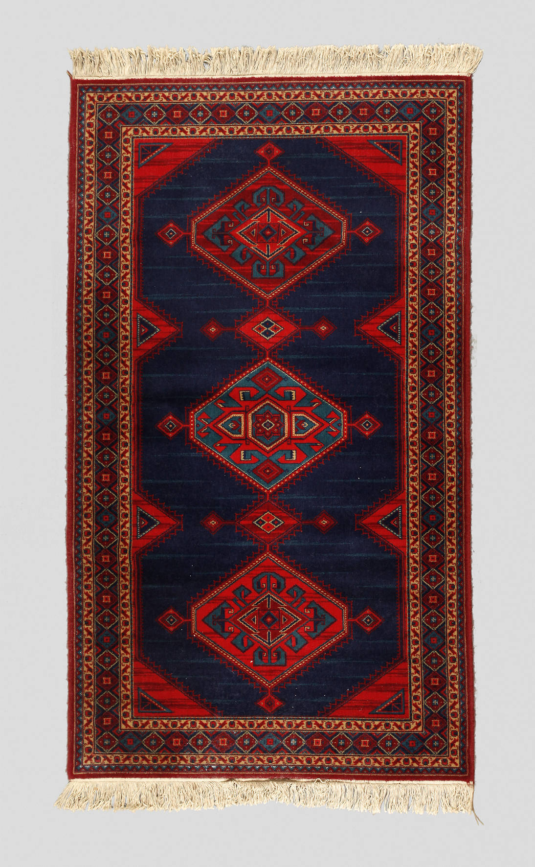 2. H. 20. Jh., in kräftigem Kolorit, schlichter geometrischer Dekor über dunkelblauem Fond mit Abrash, dreiteilige umlaufende Bordüre, gute Erhaltung, Maße 201 x 115 cm.