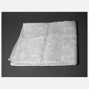 datiert 1754, feiner weißer handgewebter Leinendamast, aus vier Tüchern zusammengesetzt, flächendeckendes Dessin aus großen Blüten und Blättern im Rapport, Motiv beschnitten, je Tuch großes gesticktes Ligaturmonogramm ”AB” mit Krone und Datierung, wenige Dünnstellen, Maße ges. 175 x 150 cm, Tuch je ca. 90 x 75 cm.