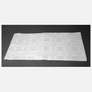 Ende 19. Jh., feiner weißer Leinendamast, geometrisches Dessin aus kleinen Quadraten und Rechtecken als umlaufende mehrteilige Streifenbordüre und quadratisch unterteilte Mittelfeldfüllung mit Akzentuierung der Schnittstellen und Zentren, eine randnahe Flickstelle (1 x 1,5 cm), Maße 280 x 140 cm.