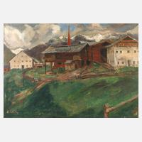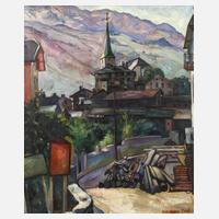 sommerliche Ansicht einer verwinkelten alpinen Ortschaft mit Kirche, vor imposanter Gebirgskulisse, minimal pastose Malerei mit lockerem Pinselduktus in kraftvoller Farbigkeit, Öl auf Leinwand, rechts unten signiert und datiert ”Hans Winkler-Dentz (19)27”, rückseitig Stempel einer Heidelberger Malutensilienhandlung und Annotationen zur Rahmung, gering farbschwundrissig, minimal restaurierungsbedürftig, gerahmt, Falzmaß 67 x 56,5 cm. Künstlerinfo: eigentlich Johann (Hans) Ferdinand Winkler, nannte sich nach der Hochzeit mit der Malerin Else Dentz 1911 ”Winkler-Dentz”, dt. Maler, Zeichner und Graphiker (1884 Heidelberg bis 1952 Heidelberg), studierte an der Kunstgewerbeschule und der Akademie Karlsruhe bei Walter Georgi und Friedrich Fehr, zunächst im Malerdorf Grötzingen bei Karlsruhe tätig, Kriegsdienst im 1. Weltkrieg in den Vogesen, ab 1920 Lehrer an der Gewerbeschule Heidelberg, unternahm in den 1920er und 1930er Jahren Studienreisen nach Italien, Oberbayern und in die Schweiz, Mitglied im Reichsverband Bildender Künstler Deutschlands und der Freien Künstlervereinigung Baden, zeitweise Leiter des Kunstvereins Heidelberg, Ehrung des Ehepaars durch Straßennamen ”Winkler-Dentz-Straße” in Grötzingen, tätig in Heidelberg, Quelle: Thieme-Becker, Dressler, Saur und Stadtwiki Karlsruhe.