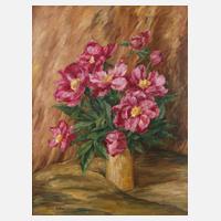 rosa blühende Pfingstrosen, in schlichter zylindrischer Vase, kraftvolle, pastose Blumenmalerei, Öl auf Leinwand, um 1930, links unten signiert „Erna Vetter“, gerahmt, Falzmaß ca. 70 x 56 cm. Künstlerinfo: dt Malerin (1887 Wittenberg bis 1954 Gotha), Studium an der Kunstgewerbeschule in Halle und an der Kunstschule Berlin, Studienreise nach Sizilien, anschließend in Gotha ansässig, verheiratet mit dem Maler Franz Vetter, Mitglied der Künstlergruppe „Die Garbe“, Mitglied im Reichsverband bildender Künstler, Quelle, Vollmer, Dressler, Mitteilungsblatt der Stadt Gotha und Internet.