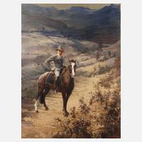 Blick entlang eines sandigen Gebirgspfads, auf einen jungen Mann im Sattel seines stattlichen Pferdes, hinter ihm Ausblick auf die Silhouette eines Gebirgszuges, pastose, teils mit breitem Pinsel erfasste Portrait- und Landschaftsmalerei, Öl auf Leinwand, Mitte 20. Jh., rechts unten signiert ”Friedr. Wegert”, min. Craquelure, in breiter ebonisierter Leiste gerahmt, IM 77 57 cm. Künstlerinfo: eigentlich Friedrich Martin Wegert, nannte sich Frieder Wegert, dt. Maler, Zeichner, Bildhauer, Schriftsteller, Verleger und Kunstgewerbler (1895 Böhringen/Döbeln bis 1980 Frankenberg), 1911–14 Lehre zum Musterzeichner für Glasdekoration bei Felix Uhlig in der Firma ”Sächsische Glasmanufaktur C. Hey” in Roßwein, 1914–15 Lehre zum Dekorationsmaler bei Georg Wilhelm in Radebeul, 1915–18 Kriegsdienst im 1. Weltkrieg, 1919–26 tätig als Schriftenmaler, Gestalter, Holzbildhauer, Tischler und Zeichner in diversen Firmen in Roßwein und Chemnitz, studierte 1925–27 bei August Heck, Karl Stephan,Willy Erb und Louis Gruber an der Kunstgewerbeschule München sowie bei Georg Mayer-Franken an der Münchner Malschule, 1927–29 Studium an der Akademie München bei Julius Diez, anschließend freischaffend in München, 1934 Studienreise durch die Schweiz, durch verschiedene Mittelmeerländer und auf die Kanaren, 1943 Übersiedlung nach Arnsdorf und später nach Böhringen, 1945–47 Mitglied der Künstlergruppe Roßwein, Mitglied im Reichsverband Bildender Künstler Deutschlands, später im Verband Bildender Künstler (VBK) der DDR, Quelle: Thieme-Becker, Vollmer, Matrikel der Münchner Akademie, Eisold ”Künstler in der DDR”, Dressler, Bruckmann ”Münchner Maler des 19./20. Jh.”, Saur und Info TU Freiberg.