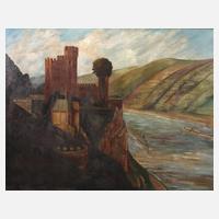 Blick auf die Burg Rheinstein in sommerlicher Landschaft, die Dampfer auf dem Wasser gemächlich dahinziehend, Öl/Lwd., um 1910, rechts unten hellsigniert, doubliert, Craquelure, in einer profilierten schwarzen Holzleiste gerahmt, diese etwas restaurierungsbedürftig, IM 90 x 114 cm.