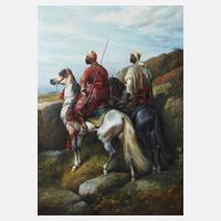 Pferde mit prachtvollem Zaumzeug, mit orientalisch gekleideten und bewaffneten Reitern, in steiniger Steppe mit spärlichem Bewuchs, teils pastose Malerei, Öl auf Leinwand, links unten signiert „A. Zimmermann“, ungerahmt, Maße ca. 70 x 50 cm.