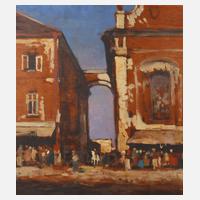 geschäftiges Treiben an Marktständen auf einer breiten Straße, skizzenhafte Darstellung mit gekonnt gesetzten Akzenten, unter Verwendung der Untergrundfarbe, Öl auf Sperrholz, rechts unten unleserlich signiert und datiert ”... 1935”, rückseitig Reste eines Galerieetikettes ”Hoffmann Fere... Budapest”, Malträger mit Rissbildung, gerahmt in geschweiftem Goldstuckrahmen, Falzmaß ca. 45 x 41 cm.