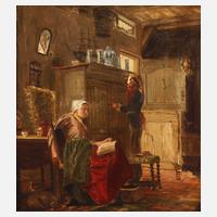 Blick ins lichte Interieur mit sitzendem, über der Lektüre eines Buches eingeschlafenem Mädchen in holländischer Tracht, und jungem Mann in der Haustür, die Schlafende mit einem Grashalm weckend, humorvolle, dünn lasierende Genremalerei, Öl auf Leinwand, 1. Hälfte 20. Jh., rechts unten undeutlich signiert ”C. K..fmann”, eventuell ”C. Kaufmann”, hinterlegte Fehlstelle in der Leinwand, restaurierungsbedürftig, gerahmt, Falzmaß 64,5 x 60,5 cm.