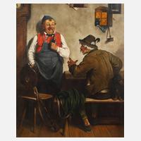 Jäger, seine Erlebnisse einem schmunzelnden Wirt in der Gasstube erzählend, Öl auf Leinwand, unsigniert, rückseitig bezeichnet „nach Kauffmann: Jägerlatein”, im profilierten, mit Eckkartuschen verzierten, goldbronzierten Stuckrahmen gerahmt, Falzmaß ca. 60,5 x 50,0 cm.