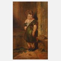 Mädchen, neben Bank und zerbrochenem Fenster im Interieur, minimal pastose Kopie, Öl auf Sperrholz, rechts unten undeutlich signiert und links bezeichnet ”nach Danhäuser”, rückseitig gestempelt ”Kopie” und teils undeutlich handschriftlich bezeichnet ”Jedes Land hat seine Reize – am 6. März 1932 Gottl. ...”, gerahmt, Falzmaß ca. 28,5 x 18,5 cm.