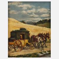bergige Landschaft mit Postkutsche, vor leuchtend gelbem Kornfeld, minimal pastose Genremalerei, Öl auf Holz, um 1920, unsigniert, minimale Altersspuren, gerahmt, Falzmaß ca. 15,5 x 12 cm.