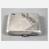 um 1920, Silber gestempelt 84 Zolotniki sowie BAK, scharniertes Gehäuse mit floral grav. Front, Öffnung mittels Druckknopf, dieser besetzt mit blauem Glascabochon, Innenleben aus grüner Kunstseide mit drei Fächern, dieses alt rep., Altersspuren, Maße 8 x 6,5 cm.