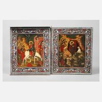 wohl Kreta, um 1800, Tempera auf Holzplatte mit partieller Goldstaffage, in Diptychonform gearbeitete Doppelikone mit kleinformatiger Darstellung des Einzugs in Jerusalem sowie auf dem anderen Flügel der Geburt Jesu, in silberner Busma gerahmt, gestempelt 84 Zolotniki sowie Punze A und 1810, innen reich verziert mit polychromem Stegemail, dieser mit kleineren Fehlstellen, IM je 9 x 7 cm, L max. 22 cm.