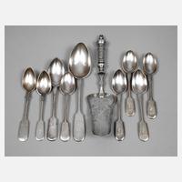 19. und 20. Jh., Tortenheber und neun verschiedene Löffel, alles gestempelt 84 Zolotniki, verschiedene Besitzermonogramme, dabei Hildegard und Else, rückseitig teilweise graviert ”Von Großmama”, die Tortenschaufel fein floral graviert, Gebrauchsspuren, L max. 24 cm, G zusammen ca. 319 g.