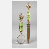 20. Jh. in der Art von Fabergé, Silber vergoldet, gestempelt 84 Zolotniki, zwei Meistermarken lateinisch AM im Rechteck und kyrillisch KF, besetzt mit kleinen Diamantrosen und Granaten, die Abschlüsse als bekrönter Doppeladler gestaltet, die Griffe transluzid emailliert auf Guillochégrund, beides mit Aufhängeösen, L 19 und 25 cm, G zusammen ca. 232 g.