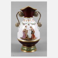 wohl Russland, um 1900, ungedeutete Marke P.A. & Co., geprägte Modellnr. 49, weitere geritzte Zeichen, äußerst fein bemalt, mittig allegorische Szenen mit Mädchen und Engel, roséfarbener Fond mit Sternchen und Festons, rs. Symbolik mit Instrumenten und Früchten, zwei eingerollte Henkel verziert mit Rosetten, die Mündung zweifach gekniffen, H 34 cm.