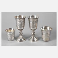 zwei Fußbecher, um 1882, gestempelt 84 Zolotniki bzw. 13 Lot, unleserliche Herstellermarke, mit ornamentaler Gravur, dazu zwei kleine konische Becher, datiert 1997 und 1891, beide Moskau mit Stadtmarke Georg der Drachentöter, Beschaumeister B.C und L.O, kyrillische Meistermarken PD und MG, H max. 10 cm, G zusammen ca. 132 g.